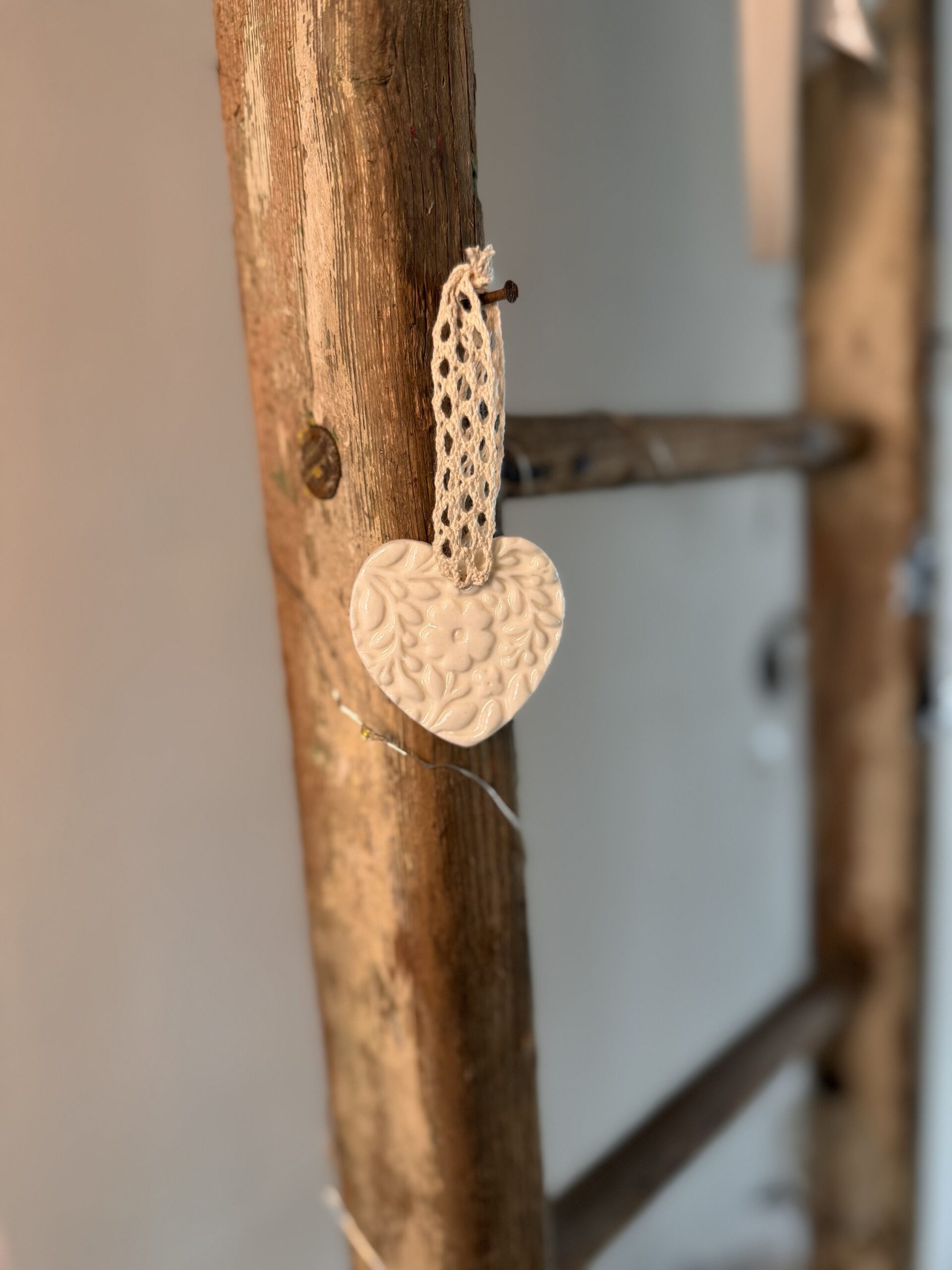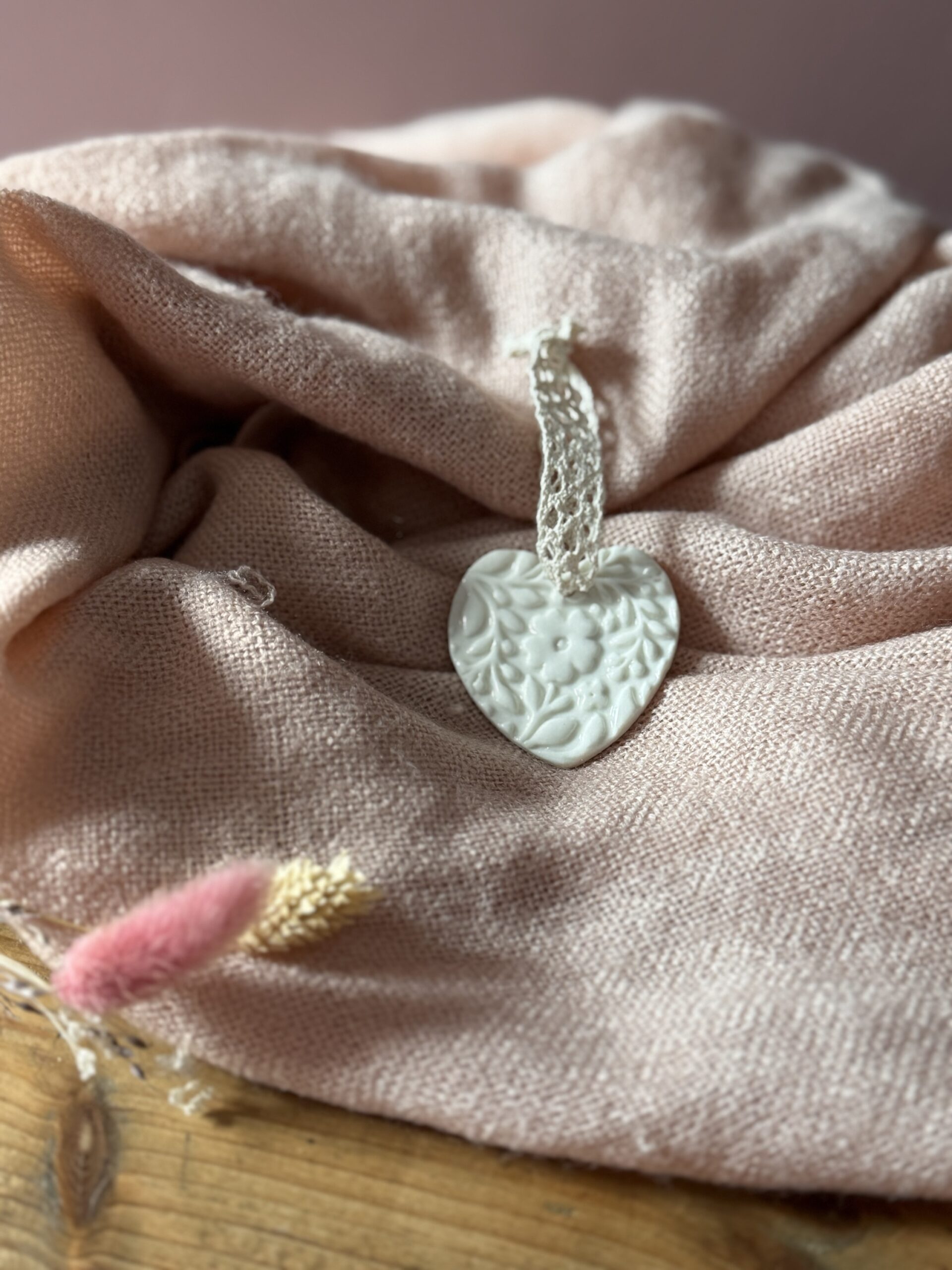 Un petit cœur en porcelaine entièrement façonné à la main, délicatement décoré d’un message plein de douceur.
