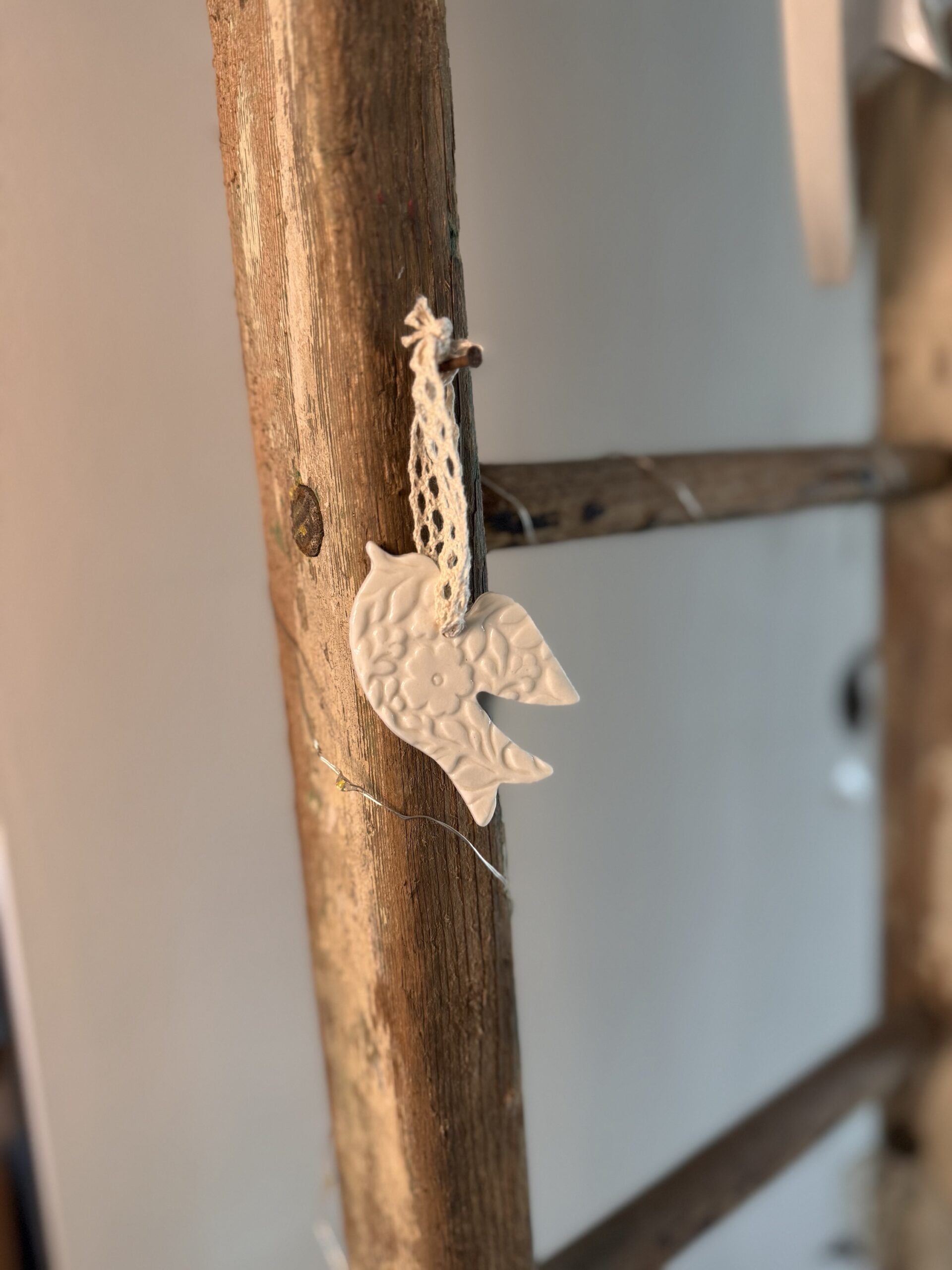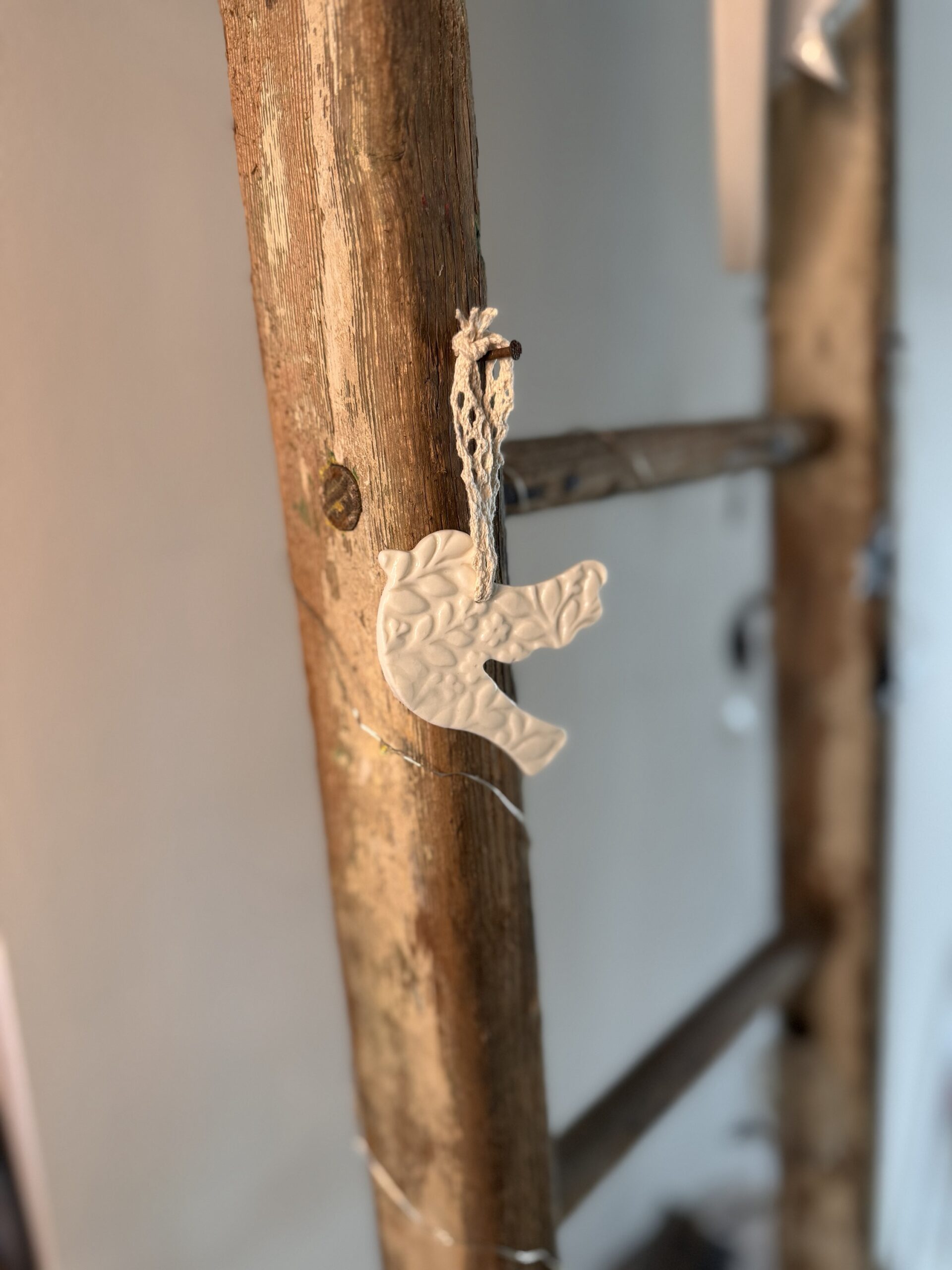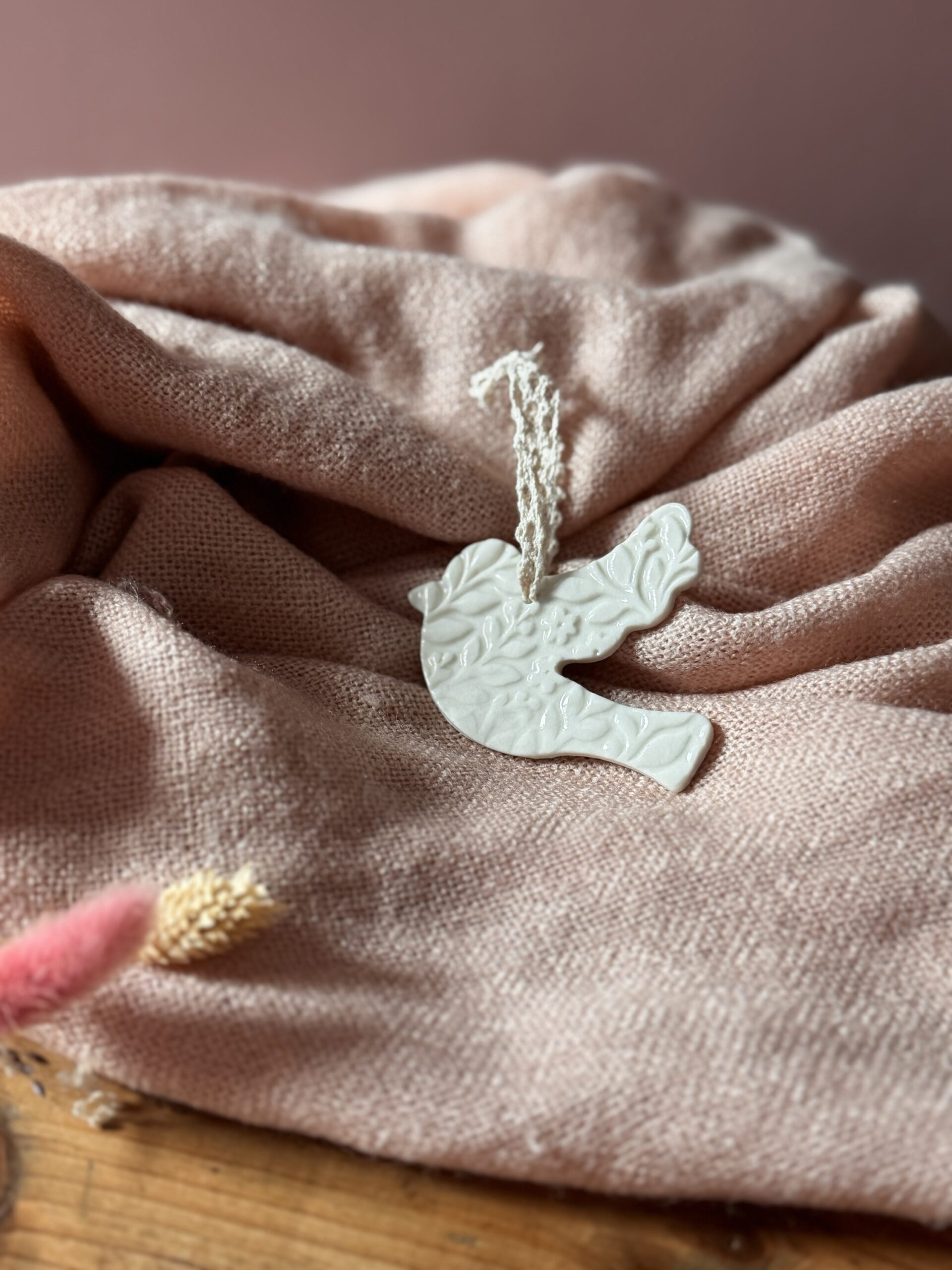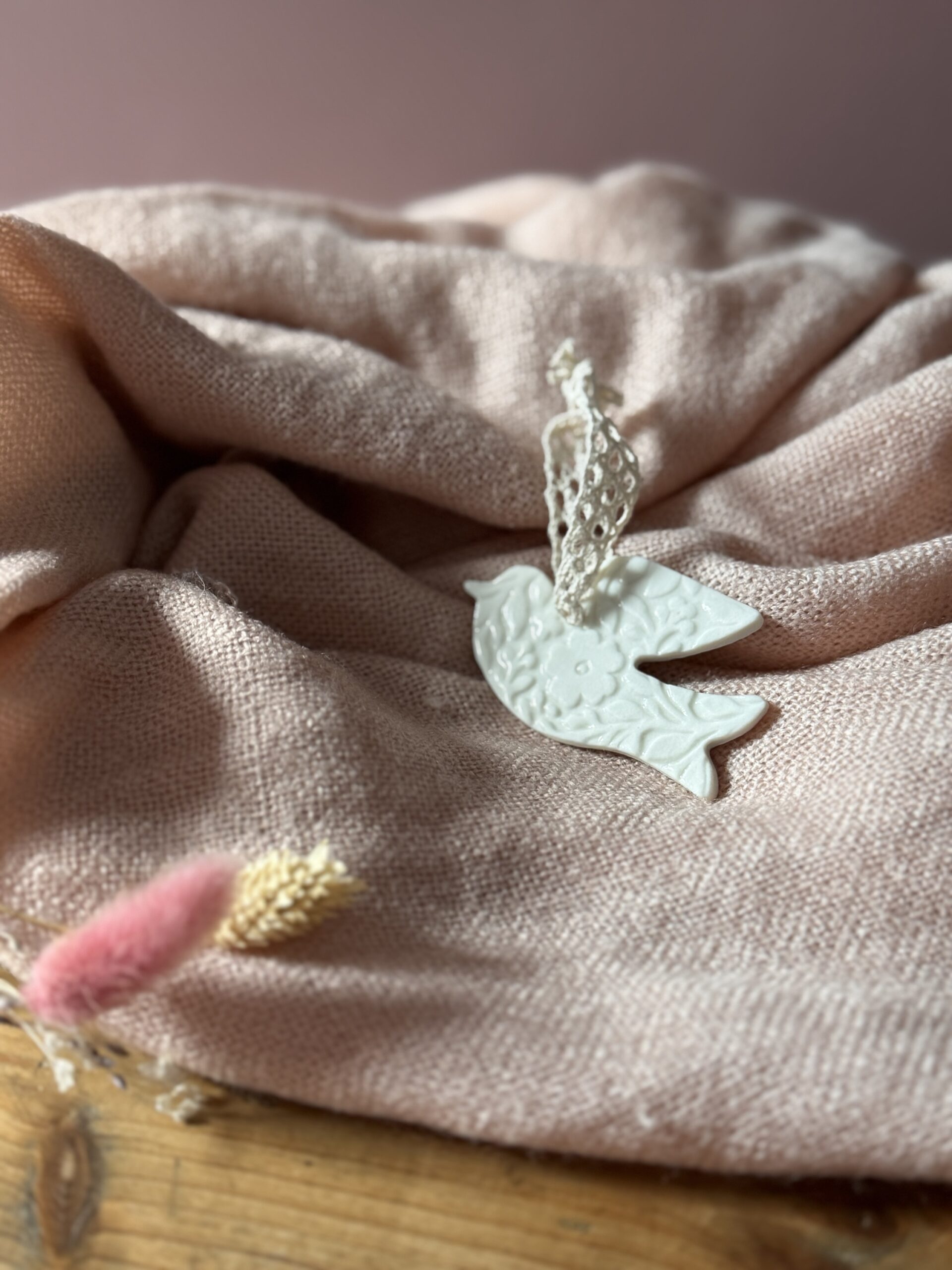 Un petit oiseau en porcelaine entièrement façonné à la main, délicatement décoré d’un message plein de douceur.