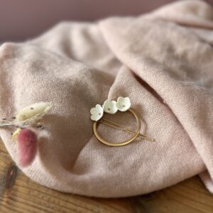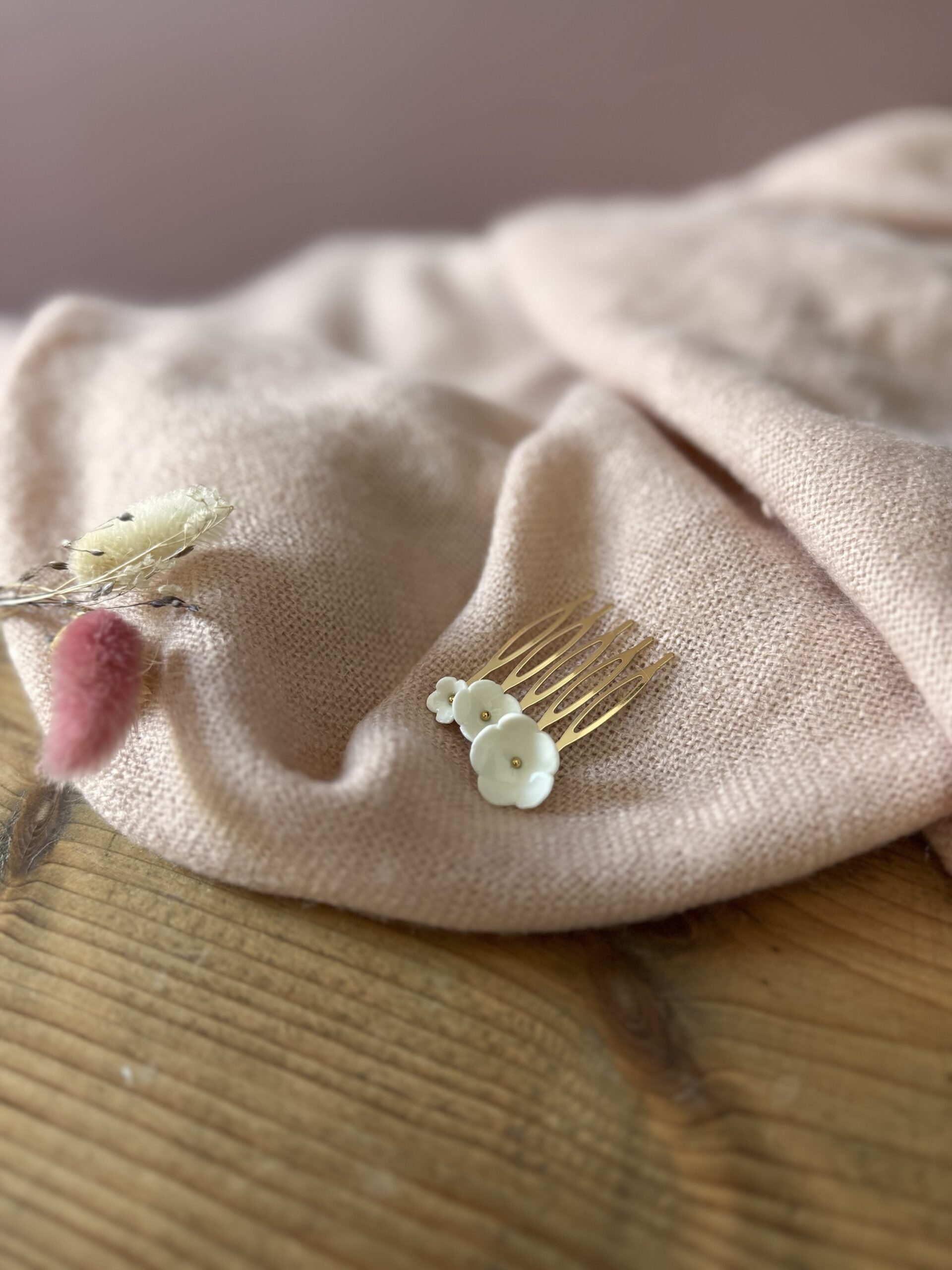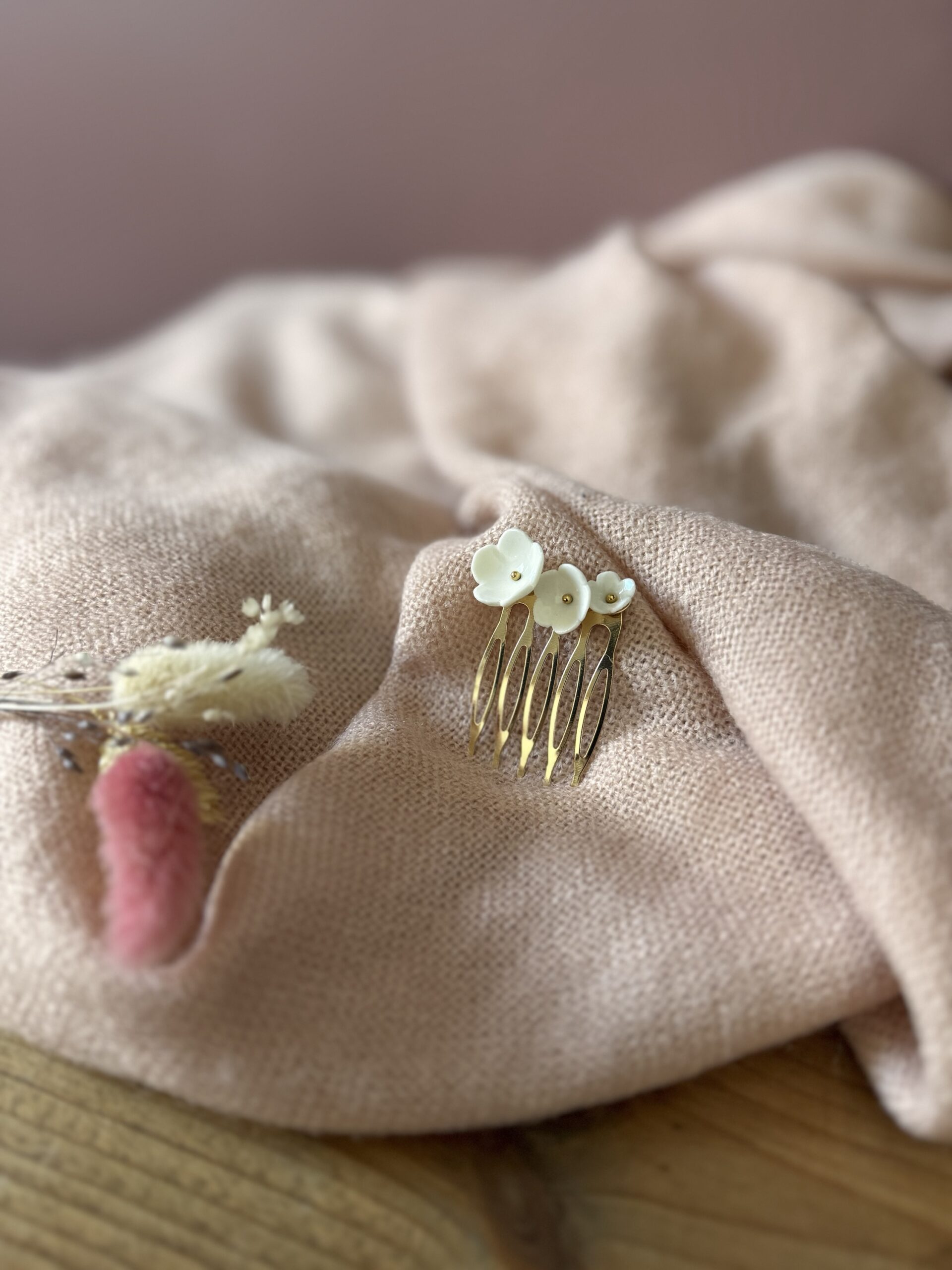 Le peigne “Perle d’aube” est une création délicate, composée de trois fleurs en porcelaine façonnées entièrement à la main.