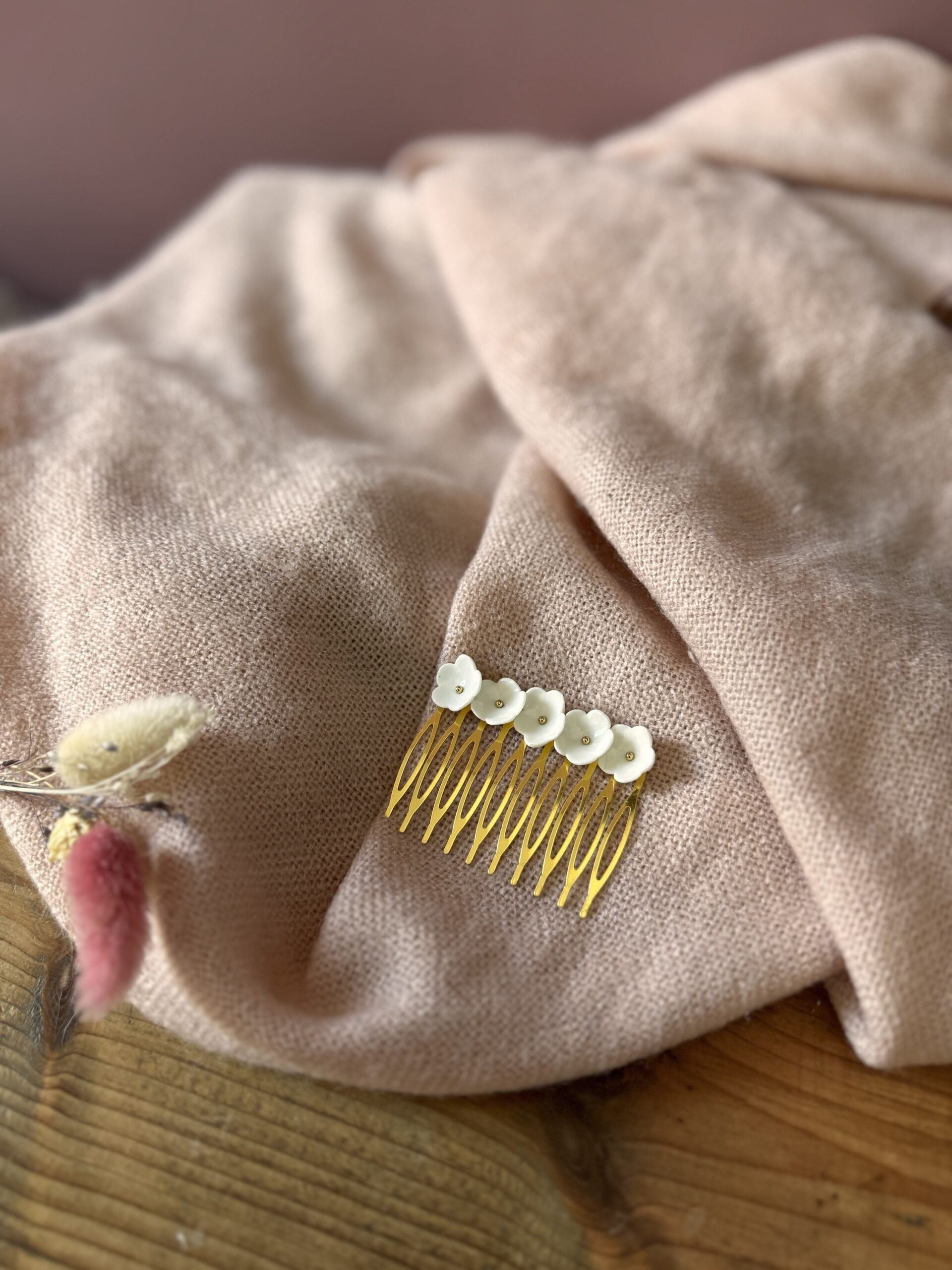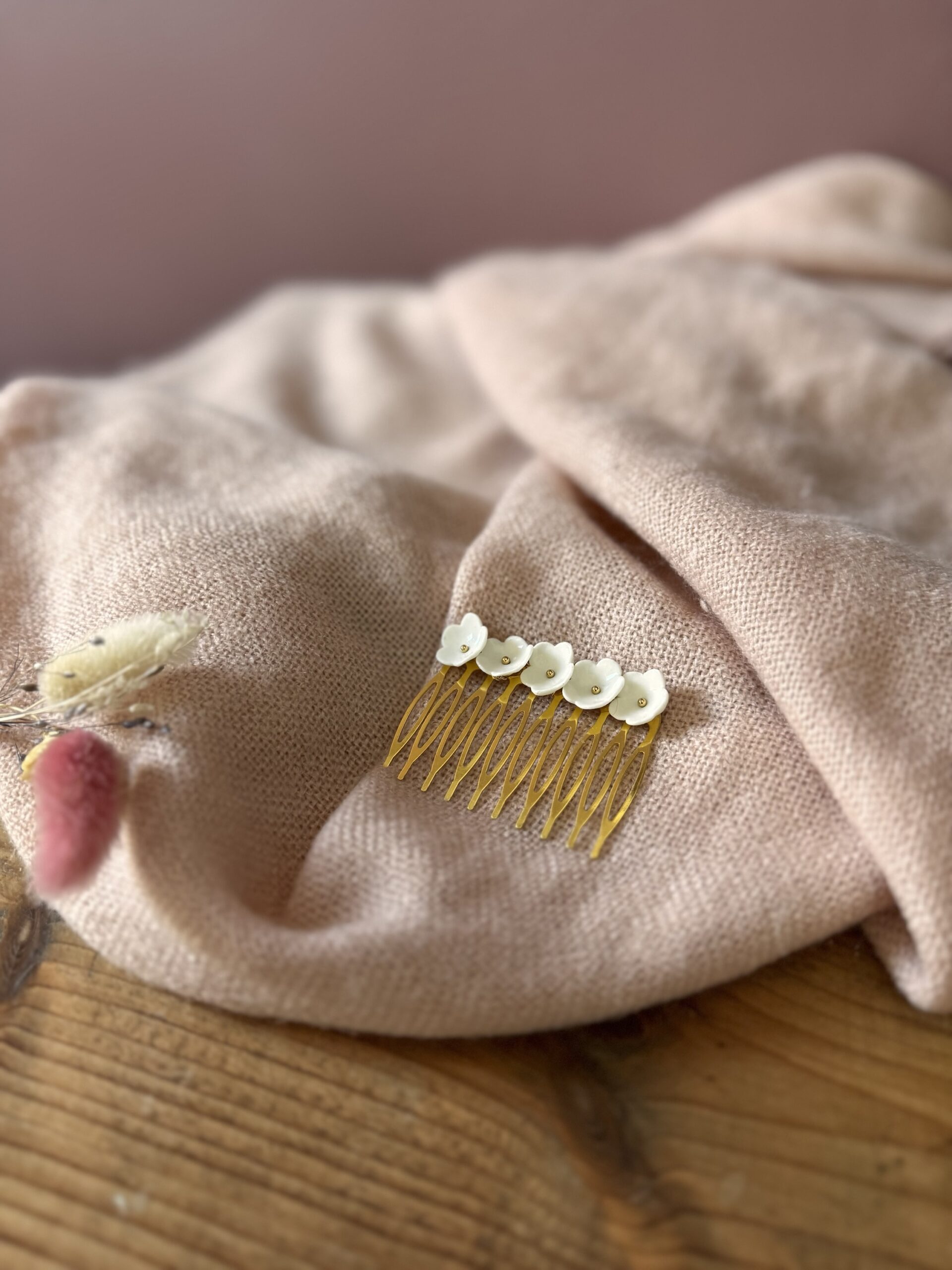Alignées sur un peigne en métal doré, ces fleurs créent un effet à la fois discret et raffiné. Ce bijou de cheveux est idéal pour accompagner un chignon flou, une coiffure de mariée ou simplement sublimer une tenue avec élégance.